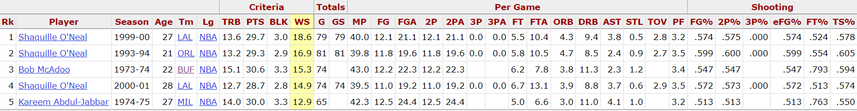 Sobra decir la importancia de estos jugadores y el contexto en el que lo consiguieron. Jabbar logró su segundo MVP un año antes de llegar a esos números con los Milwaukee Bucks. McAdoo, uno de los jugadores más infravalorados cuando se tiende a situar rankings históricos, lo fue un año después de conseguirlo y Shaquille lo logró una primera vez con Orlando y las otras dos ya como Laker, llevándose el MVP del año 2000. Que el bueno de Shaq solo tenga un MVP (al igual que Kobe) dice mucho. También de sus rivales, dado que en los otros años en los que promedió los números que hoy está haciendo ‘la Ceja’ el galardón al mejor jugador fue a parar a Olajuwon y Karl Malone. Nombres mayores.