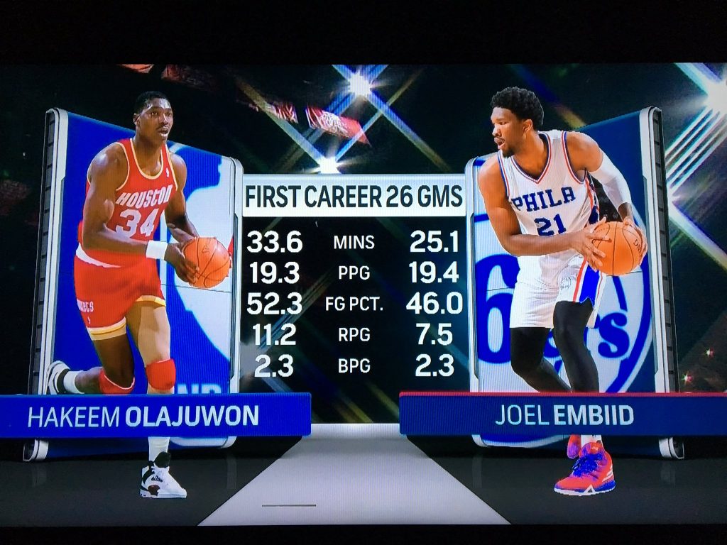 En los primeros 26 partidos de Olajuwon y Embiid, los promedios no son tan dispares: 19,3 puntos de “The Dream” por los 19,4 de “The Process”, 52,3% en TC contra 46%, 11,2 rebotes contra 7,5, e igualdad máxima en tapones con 2,3 cada uno. Tengamos en cuenta la diferencia de minutos, Hakeem promediaba 33,6 y Embiid 25,1.